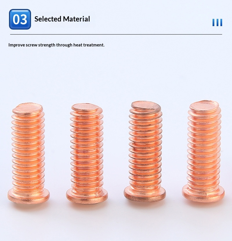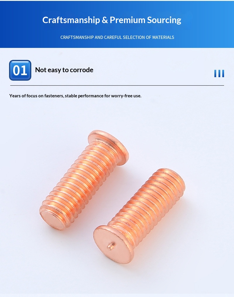 Our standard welding screws are made of high-quality low-carbon steel with copper plating.