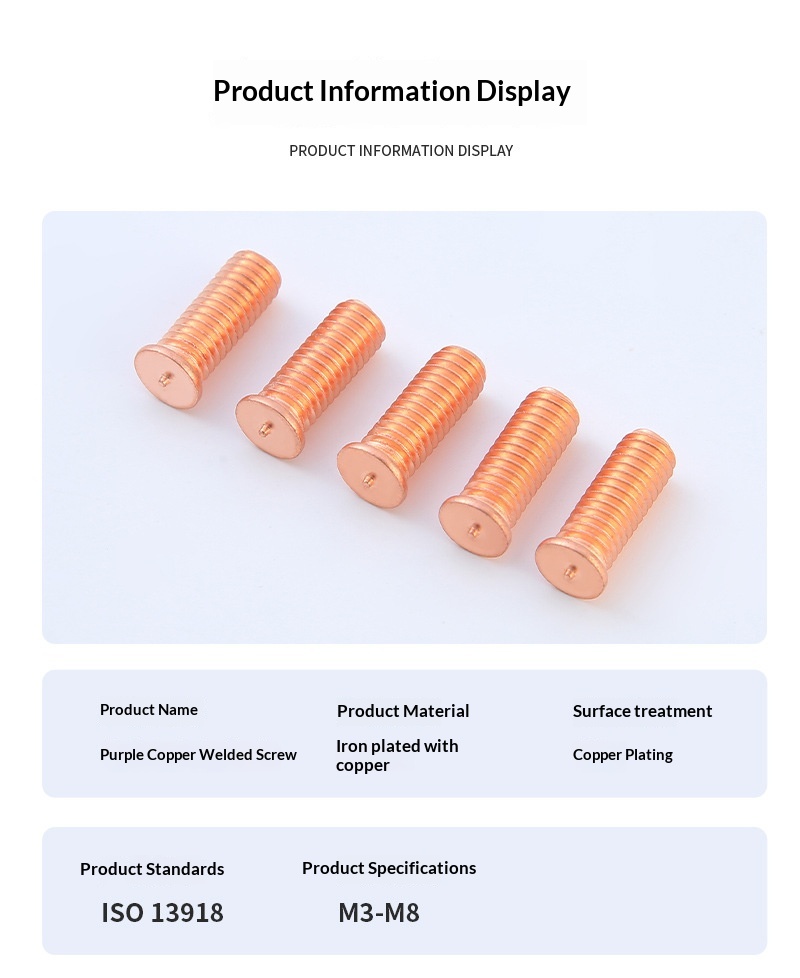 Welding screws, also known as spot welding studs, CD weld studs, planting welding pins and stud welding bolts, are high-precision fasteners specially designed for automatic stud welding on thin metal sheets. Our copper-coated carbon steel welding screws are manufactured in strict accordance with international standards, featuring stable performance, reliable welding and strong durability, which are widely used in sheet metal processing, electrical cabinets, automobile manufacturing, home appliances, communication equipment and construction hardware industries.